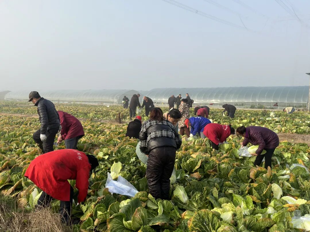这是新桥社区乡村振兴项目“黄场扶贫大棚”收获的一批新鲜白菜。当日一大早,社区党员干部与志愿者走进田间地头,采摘、精捡、打包、装车。