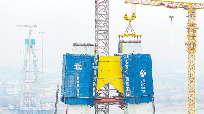 2月13日,中国铁建大桥局建设者在荆州观音寺长江大桥北岸主塔顶部进行上部钢壳-混凝土塔柱施工。(记者 柯皓 通讯员 秦克明 摄)