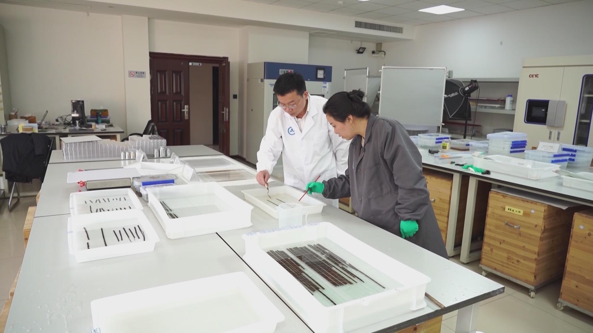 全国人大代表、荆州文物保护中心主任方北松:“这个是连二亚硫酸钠,是还原材料,用了这个脱色方法对简牍本体没有损伤,字迹是不受影响的,我们也是在全国做了有20来万枚简的脱色。”