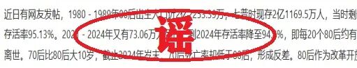 近期,一则“截至2024年末,80后死亡率突破5.2%,相当于每20个80后中就有1人已经去世”谣言引发广泛关注,有个别网民借机造谣、煽动负面情绪、售卖保健品。公安机关网安部门依法开展调查。
