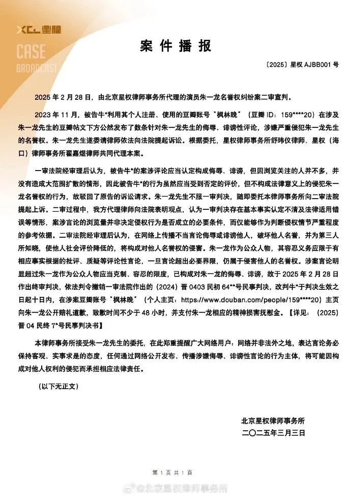 近日,由北京星权律师事务所代理的演员朱一龙名誉权纠纷案二审宣判。