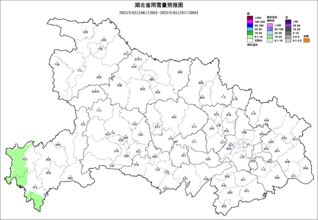 3月6日20时-7日08时,恩施地区阴天有零星小雨,高山区有雨夹雪或雪;其他地区多云。最低气温2~6℃,偏北风2到3级、阵风4到5级。