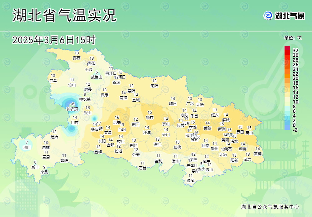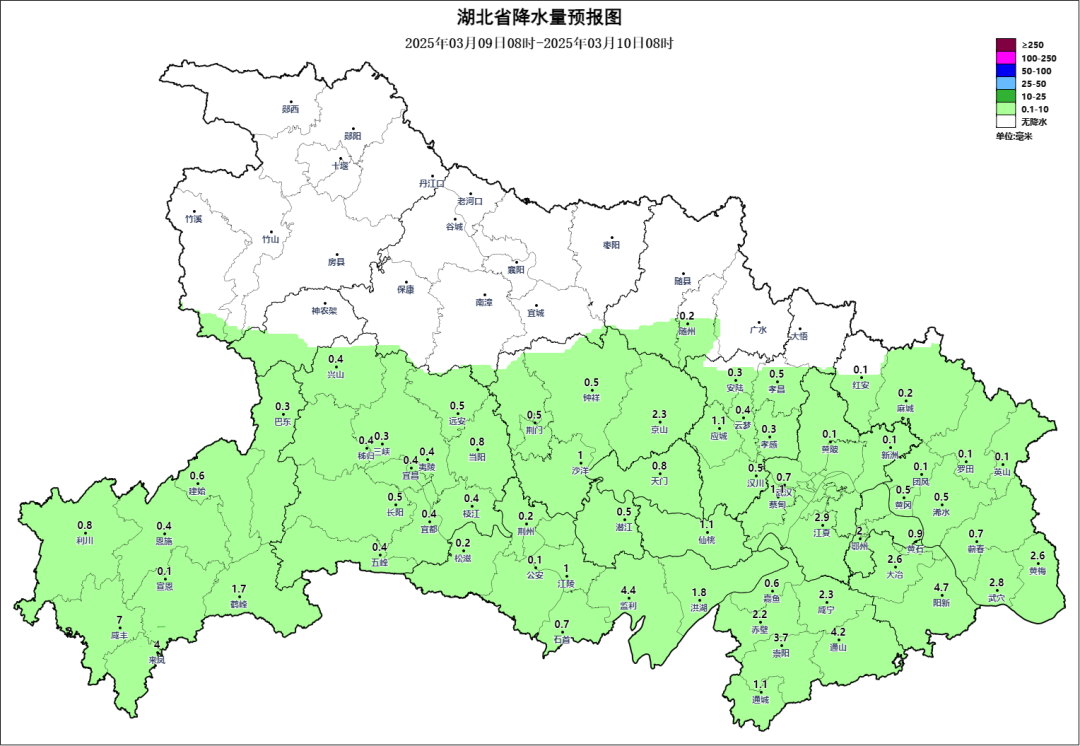 3月9日08时-10日08时,鄂西南、江汉平原南部、鄂东北南部、鄂东南小雨转多云;其他地区阴天到多云。最高气温北部12~16℃、南部8~12℃,最低气温3~8℃,偏南风2到3级。