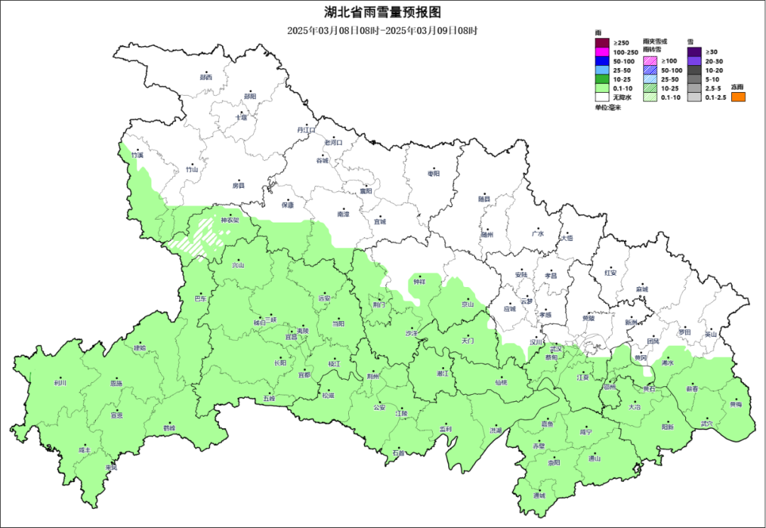 3月8日08时-9日08时,鄂西北南部、鄂西南、江汉平原、鄂东南多云转小雨;其他地区多云到阴天。最高气温恩施地区10~13℃、其他地区13~18℃,最低气温3~8℃,偏南风2到3级。