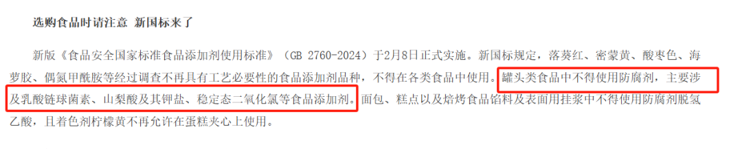 GB 2760-2024《食品安全国家标准食品添加剂使用标准》已于2025年2月8日正式生效,其中明确规定:罐头类食品中不得使用防腐剂。