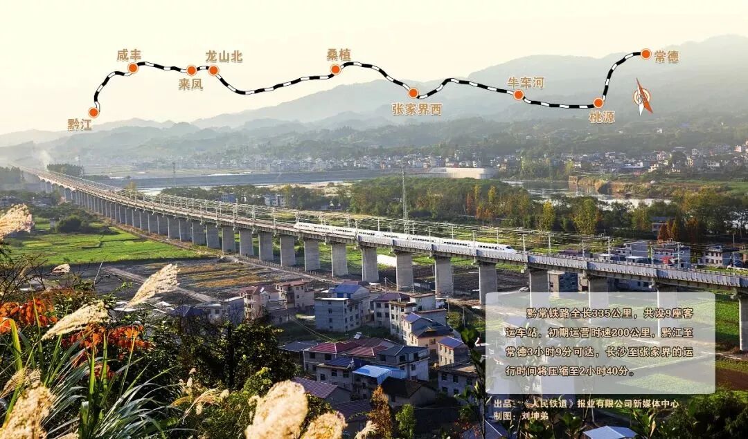 黔常铁路起于重庆市黔江区,向东经湖北恩施土家族苗族自治州咸丰县、来凤县,湖南湘西土家族苗族自治州龙山县、张家界市桑植县、永定区,终至常德市。线路全长335公里,全线共设黔江、咸丰、来凤、龙山北、桑植、张家界西、牛车河、桃源、常德9座客运车站,初期运营时速200公里。