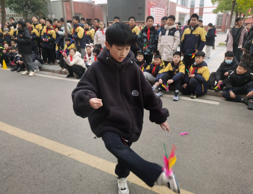 这是荆州实验小学城中校区大课间时,六(2)班学生快乐踢毽子的热闹场面。类似的大课间在荆州实验小学其它四个分校区也屡见不鲜。
