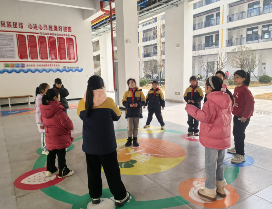 “地面上印有不同的图案,每个人站在一个图案上面,一人开始边做下蹲,一边随机喊口令:xx蹲,xx蹲,xx蹲完xx蹲,反应慢或者蹲错者出局……”在荆州实验小学城南校区,学生们大课间时正在做地面游戏。
