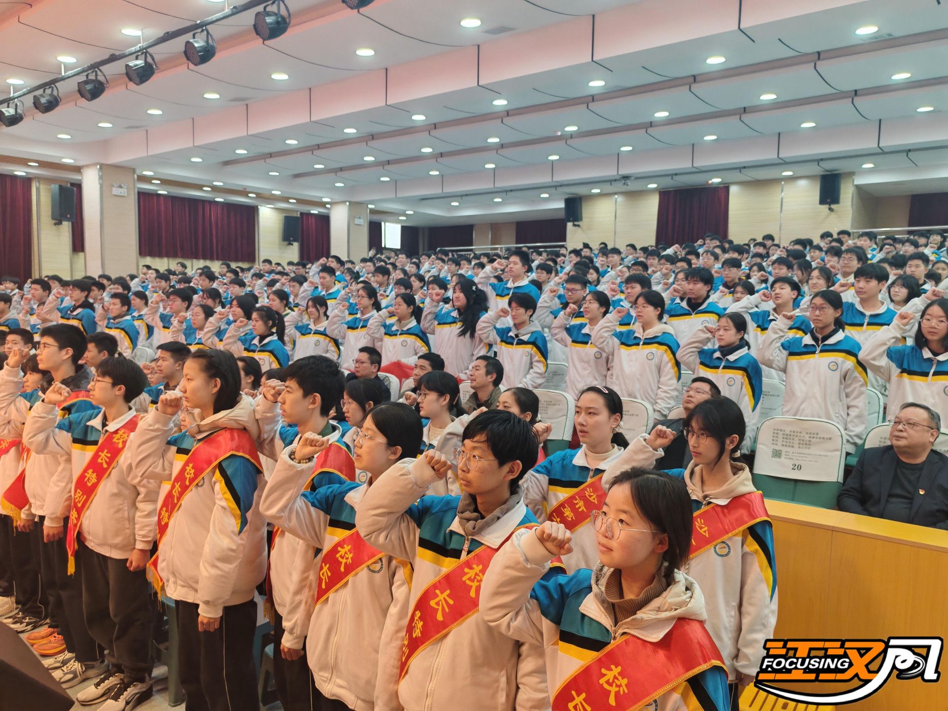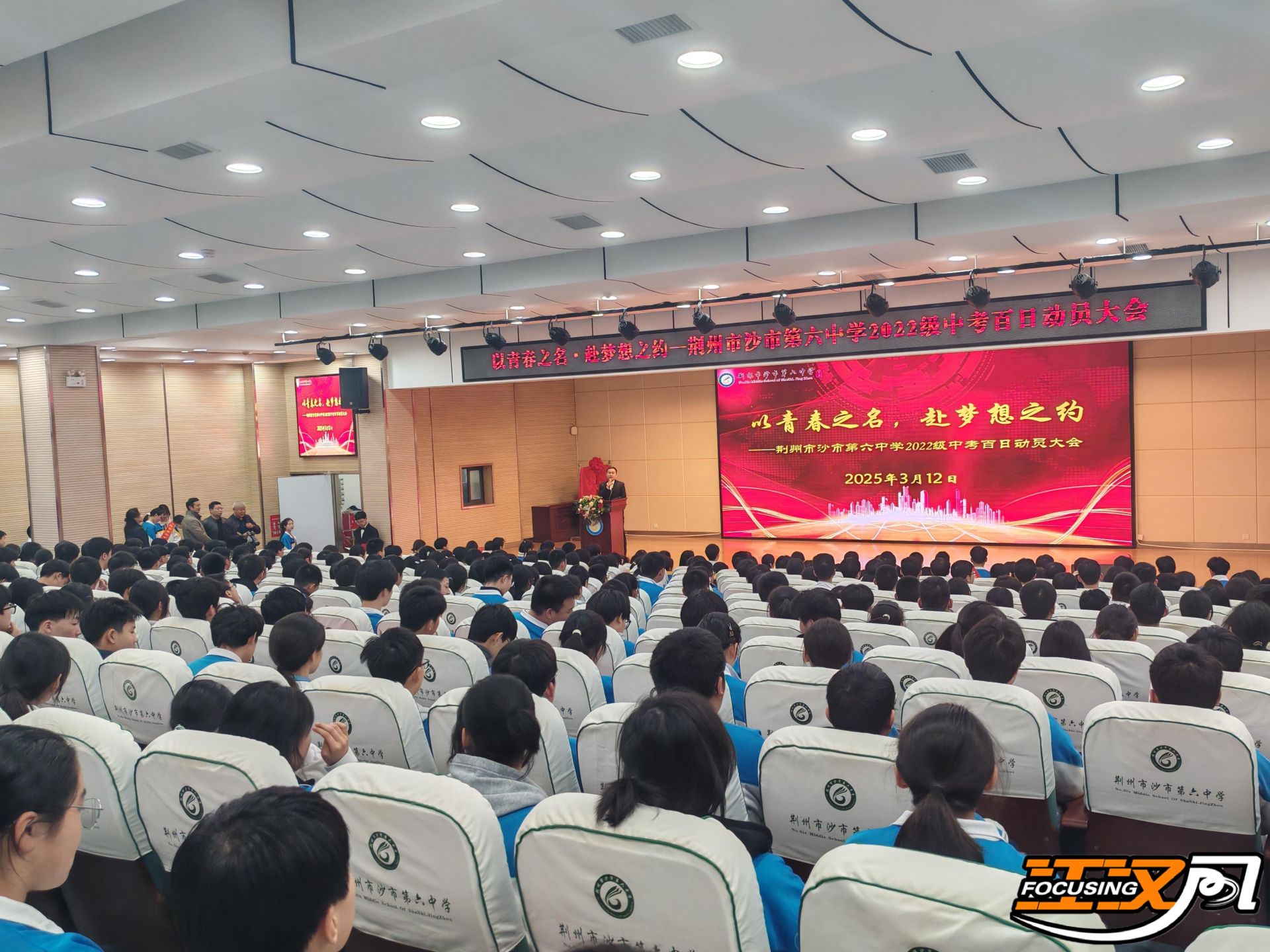 江汉风报道:3月12日下午,沙市第六中学2025届中考百日动员大会在学校报告厅举行。初三年级全体师生齐聚一堂,共同吹响冲刺中考的号角。
