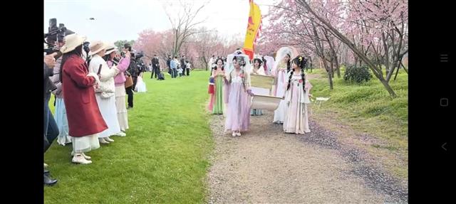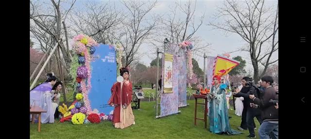 下午2点,浅山森林美术园内衣袂飘摇、环佩叮咚,身着不同朝代服饰的"花神"执团扇、簪春英,沿着小径缓缓巡游。锦绣华服的佳人青丝高挽,步摇轻颤,她们穿梭于烂漫花丛间,或拈花浅笑,或顾盼生姿,仿佛从千年时光中走来,与春日繁花相映成趣。