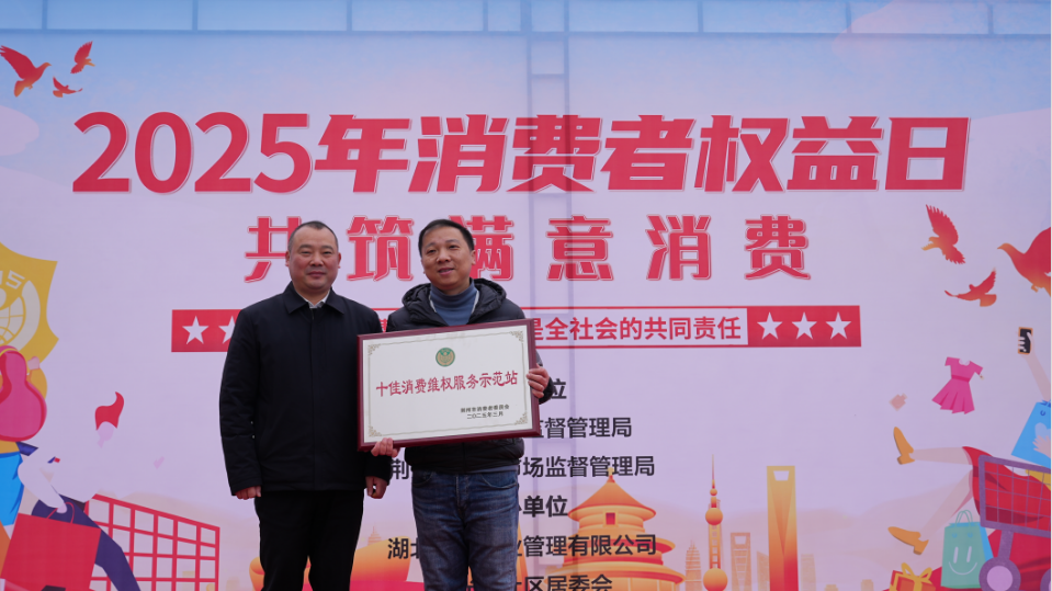 经开区党工委委员、管委会副主任李程云为武汉武商超市管理有限公司沙市店颁发荆州市2024年“十佳消费维权服务示范站”荣誉牌匾。