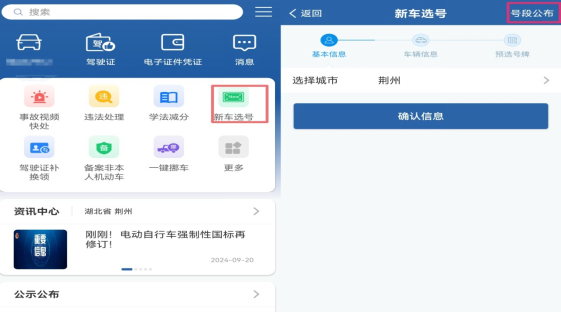 选号还有几个小技巧,有选号需求的车主可提前关注交管12123APP中“新车选号”或“在用车选号”的“号段公布”,及时掌握号牌投放时间及号段;号段自动更新频率视业务量而定,一般小型汽车号段2天左右更新,小型新能源汽车号段7天左右更新;互联网随机选号开始前,可以勾选“过滤4”。