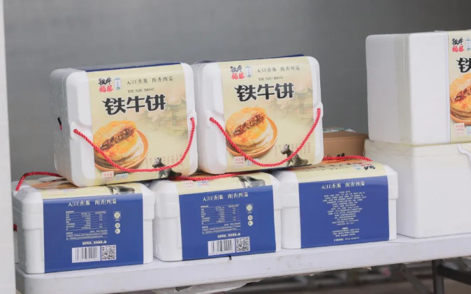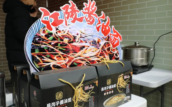 主持人在现场推介铁牛饼、酱油面和菊花茶