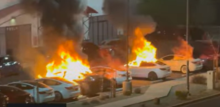 据美国哥伦比亚广播公司报道,拉斯维加斯当地时间18日发生特斯拉汽车遭纵火事件。图为报道所配视频中的画面