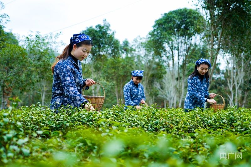 身着传统采茶服的茶农正在采茶(央广网记者左洋 摄)