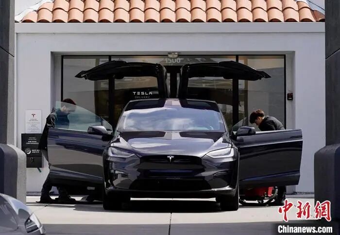 资料图:美国加州圣马特奥县一家特斯拉电动车销售店的工作人员清洁一辆特斯拉电动车。 中新社记者 刘关关 摄