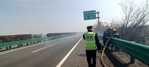 仅仅几分钟后,荆州市公安局高警洪湖大队民警抵达事发地。只见起火点周边的枯草在干燥天气的“助力”下迅速弥漫开来,严重影响了路面的行车视线,过往车辆纷纷紧急避让,险象环生。