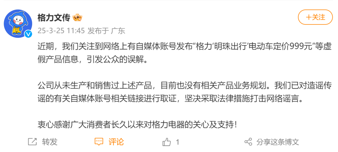 3月25日午间,@格力文传发微博表示,近期,我们关注到网络上有自媒体账号发布“格力‘明珠出行’电动车定价999元”等虚假产品信息,引发公众的误解。