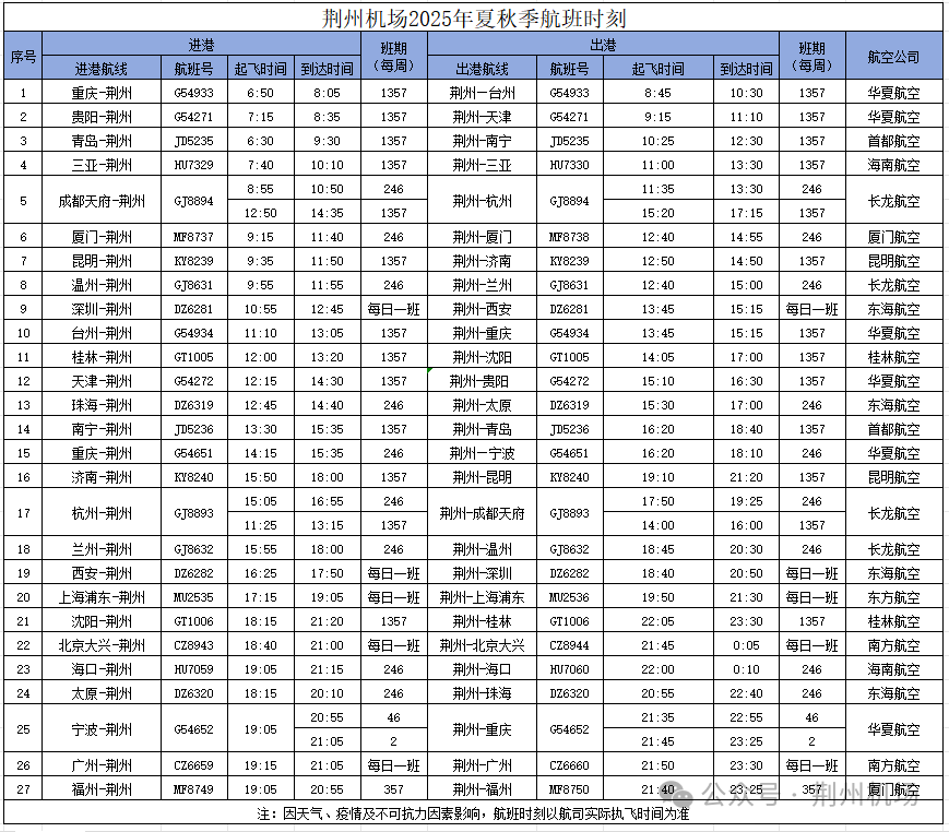 根据民航航班换季时刻安排,自2025年3月30日至2025年10月25日,荆州机场将执行夏秋航季航班计划。