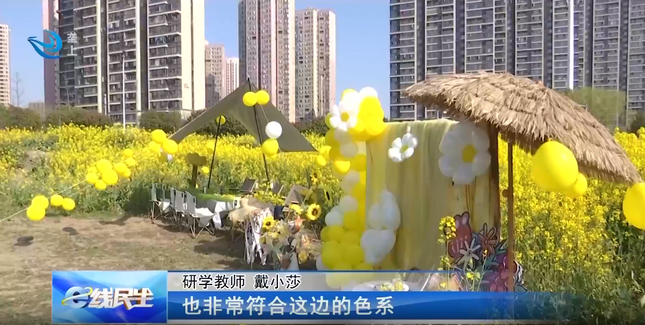 研学教师 戴小莎:我们今天在这边办活动,主要是看中这边场地非常漂亮,而且油菜花也比较符合我们现在的季节。我们今天为小朋友准备了涂鸦的帐篷,还有休息的场所,整个环境布置也非常符合这边的色系。