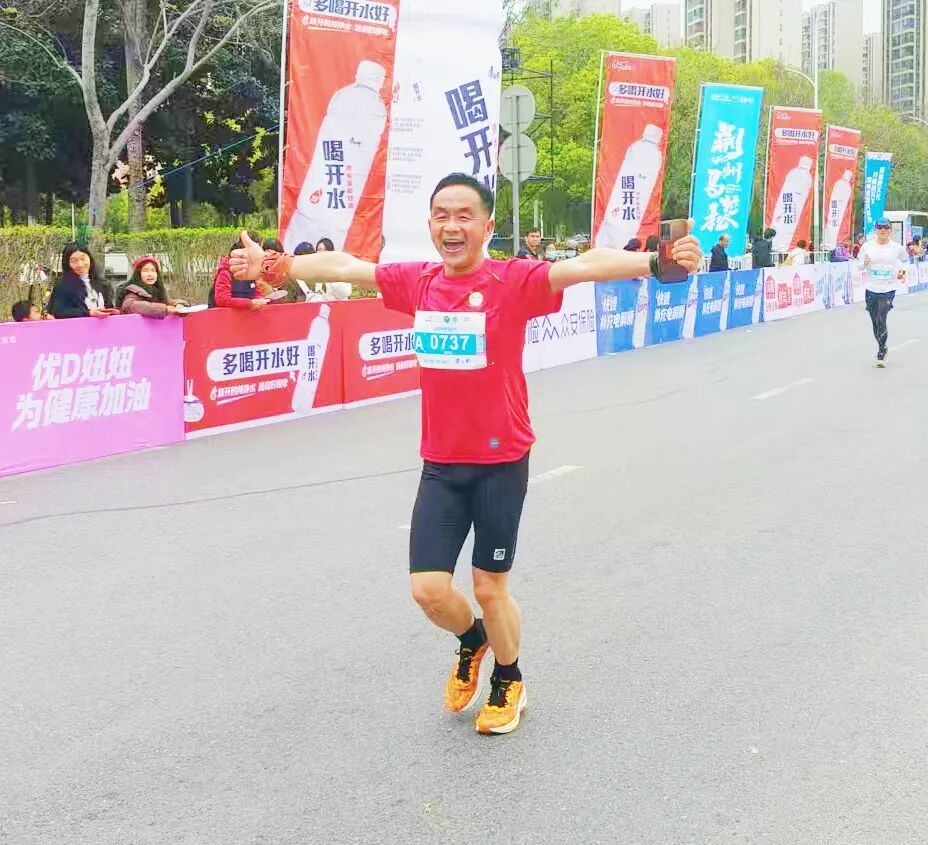 荆州区人民法院副院长朱君,参加半马顺利完赛。这位身着跑服的"法官跑者"在冲过终点线后表示:"跑步和司法工作一样,都需要持之以恒的毅力。"