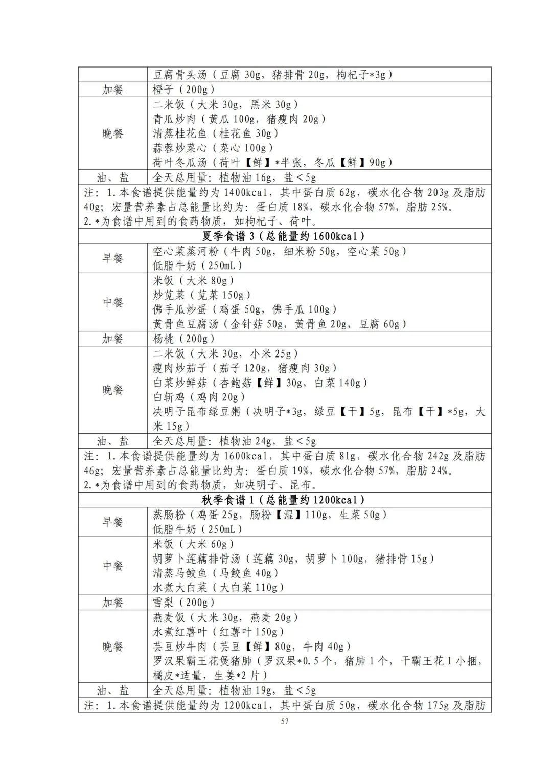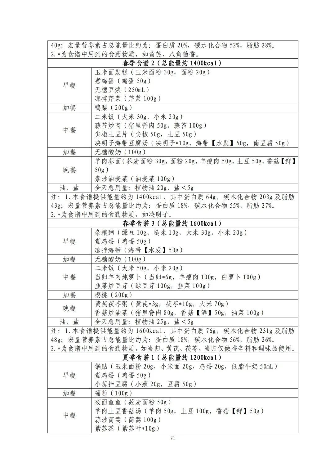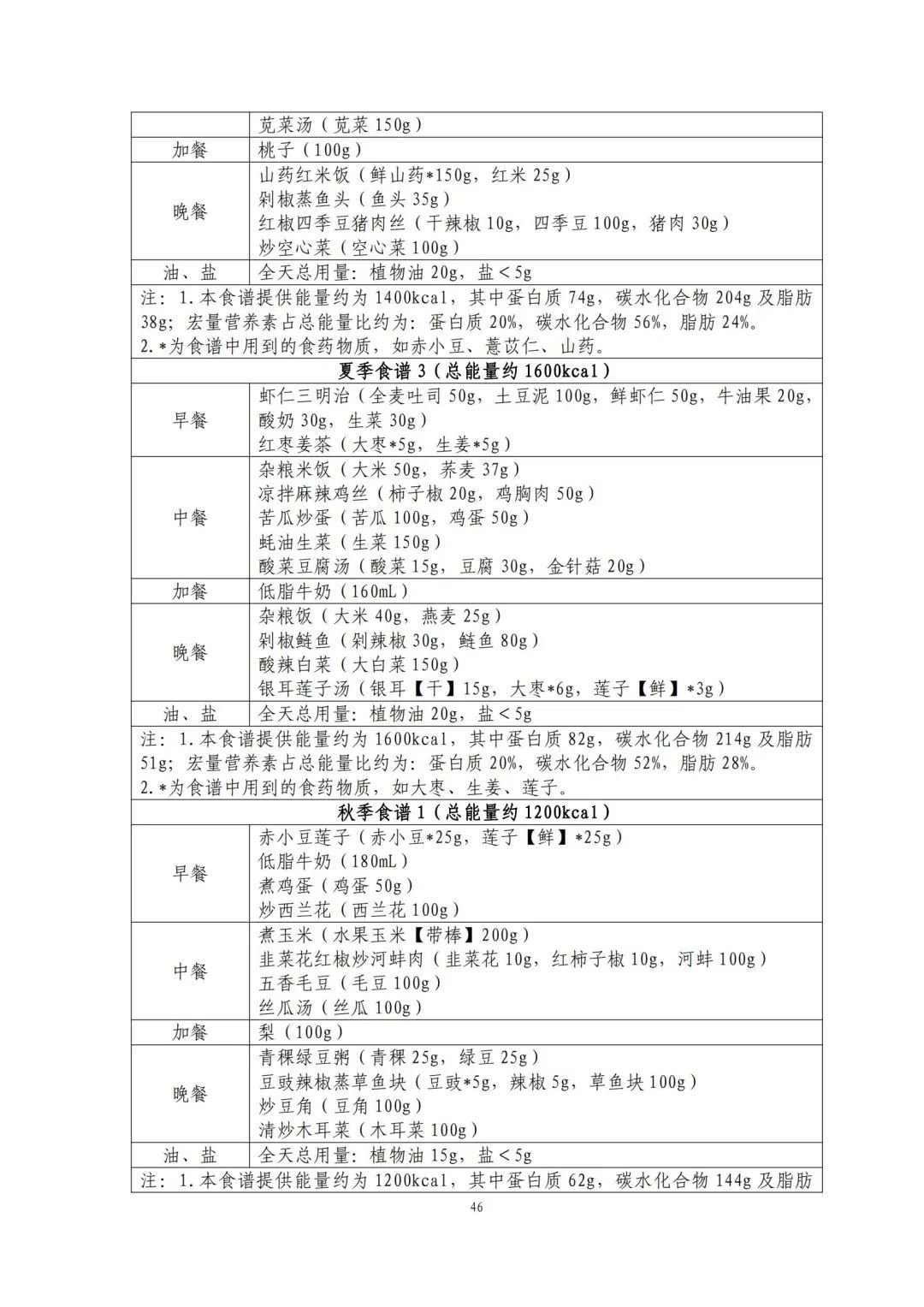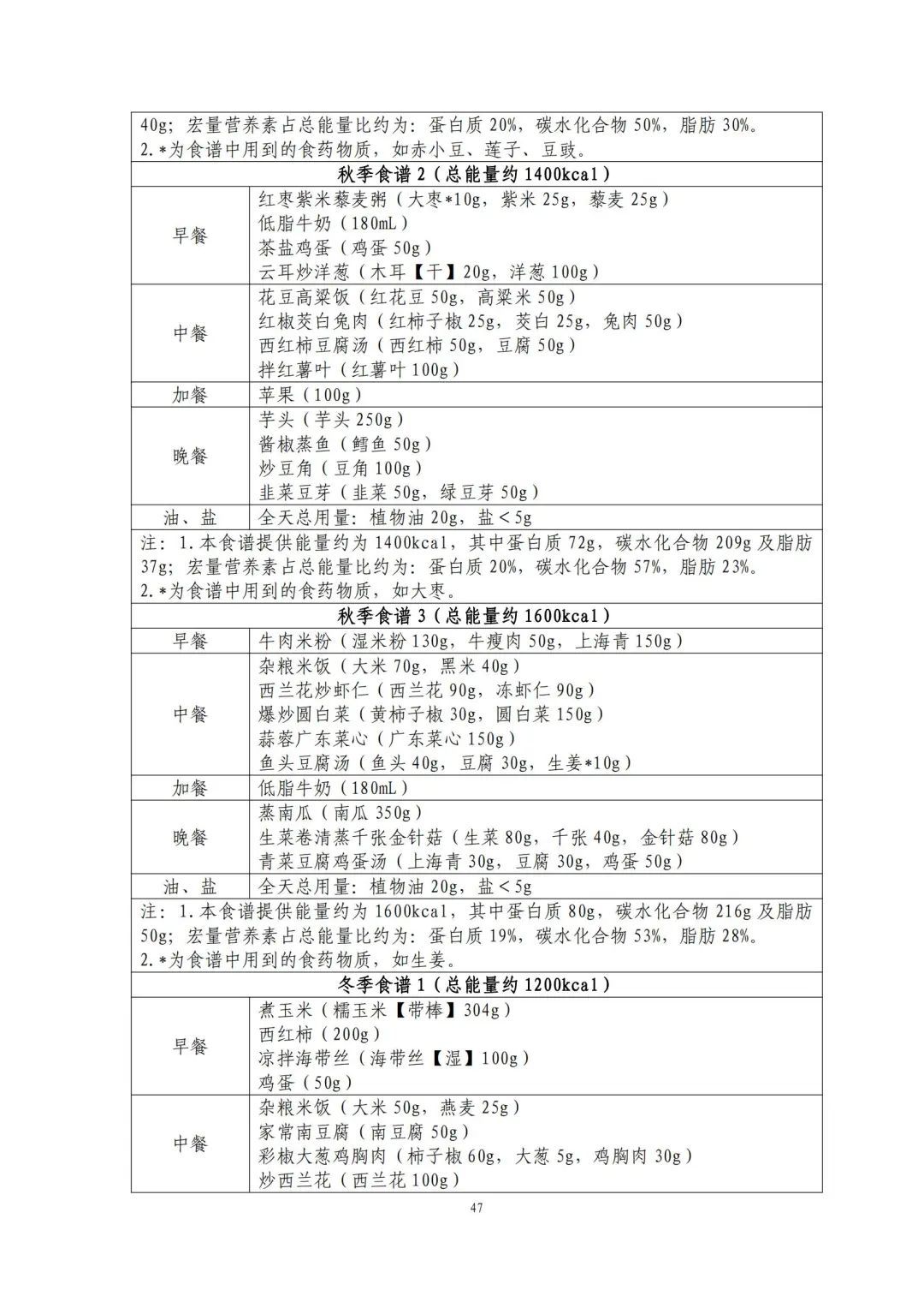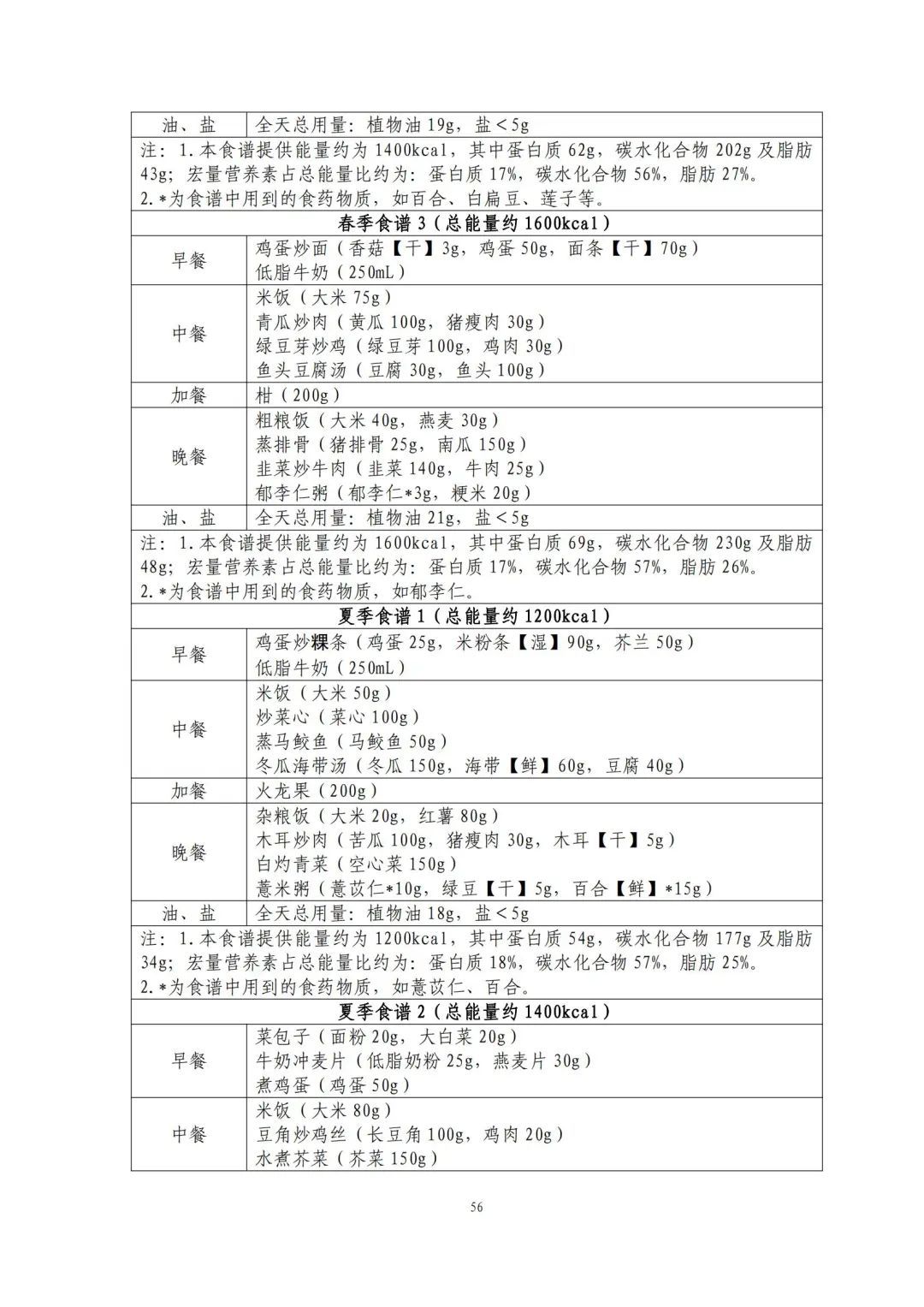 这份食谱细化到了全国不同地区的食谱示例,并备注了食谱的“总能量”。
