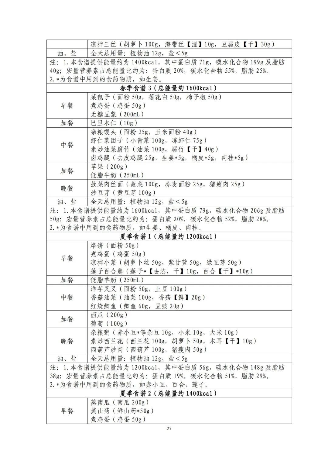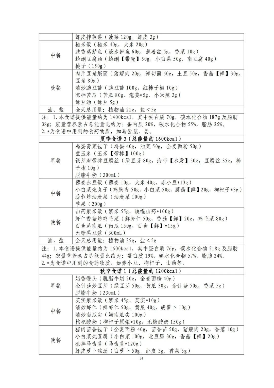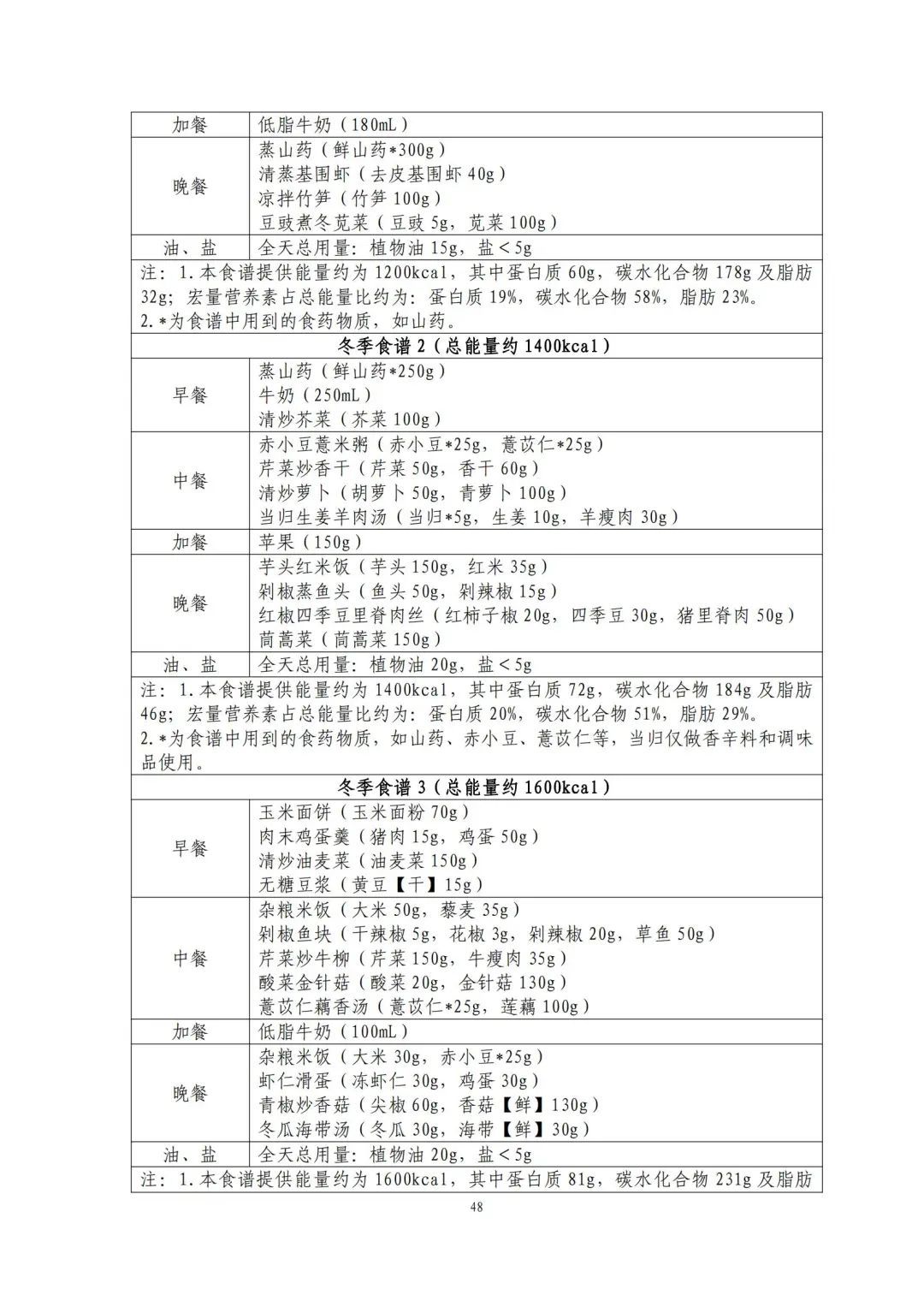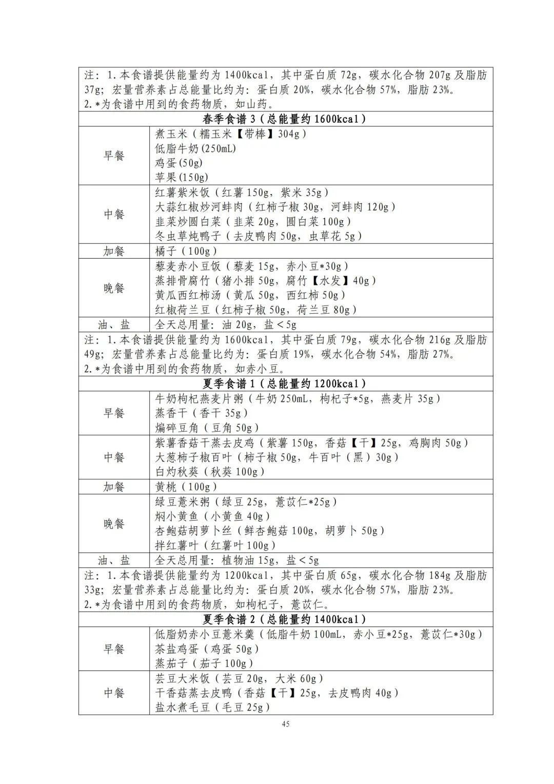 这份食谱细化到了全国不同地区的食谱示例,并备注了食谱的“总能量”。