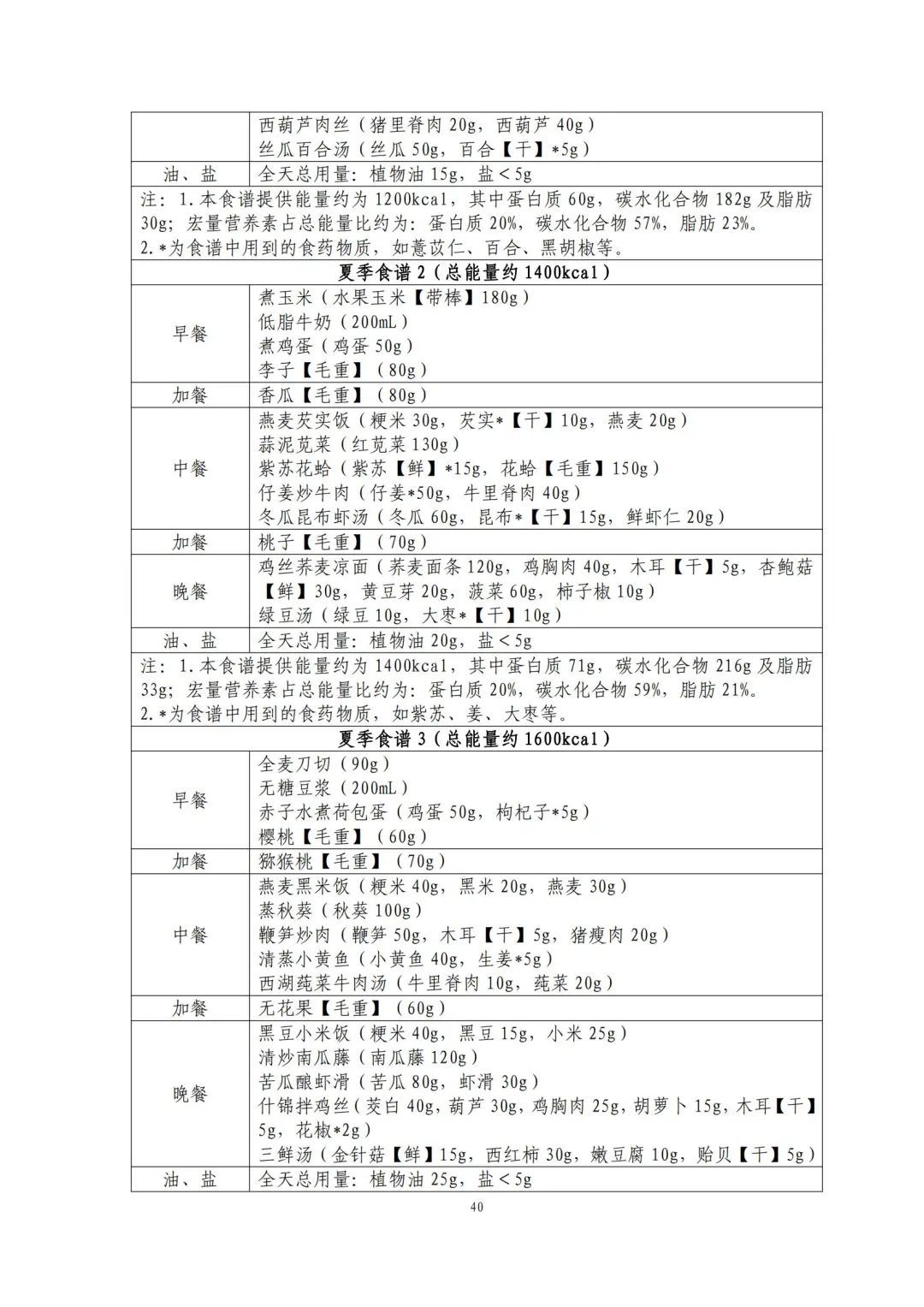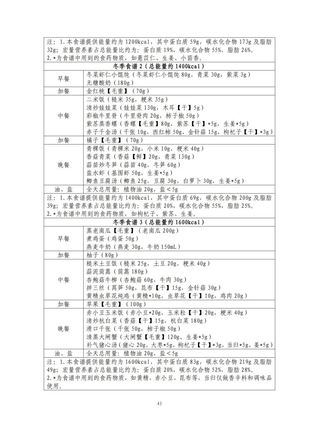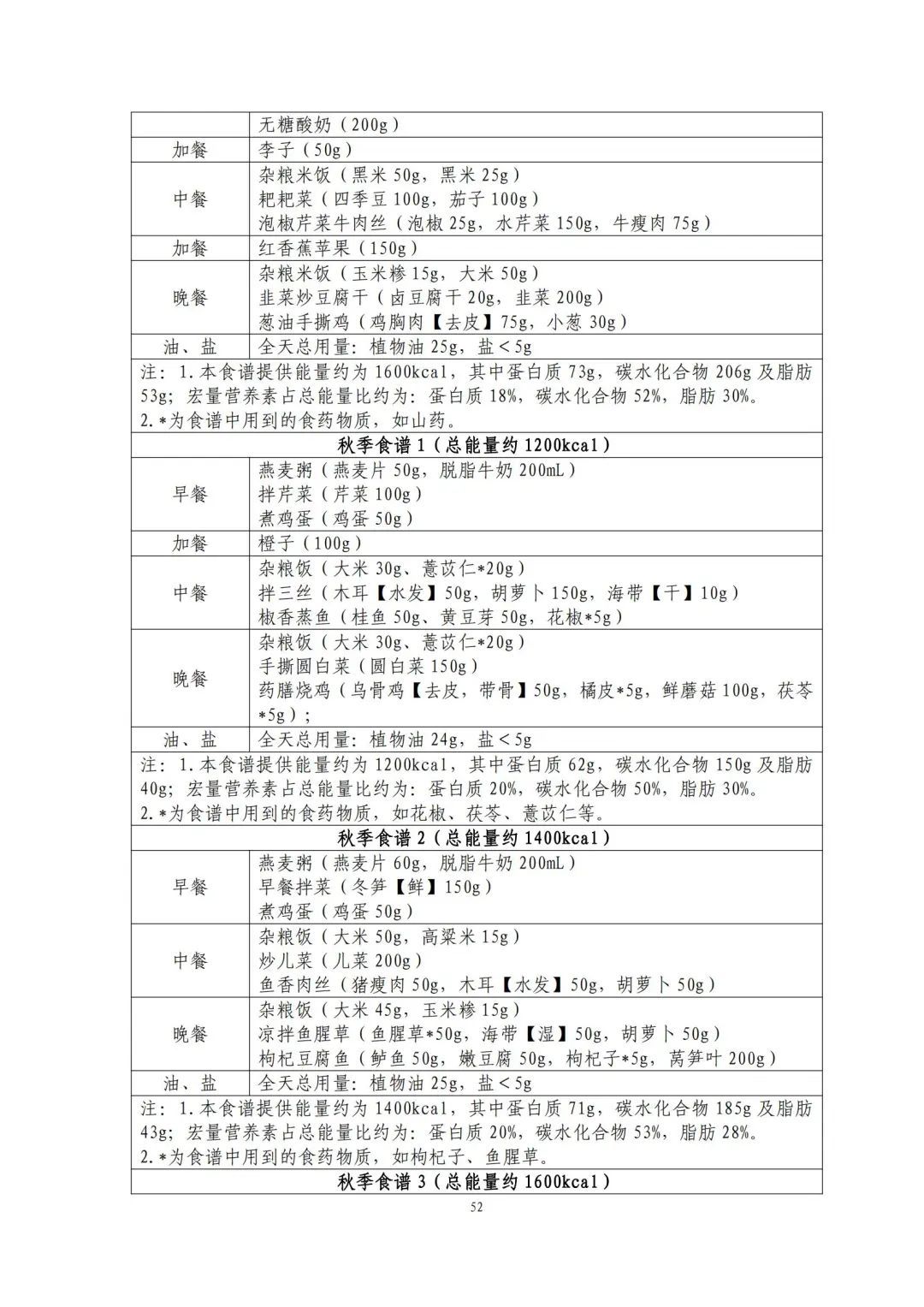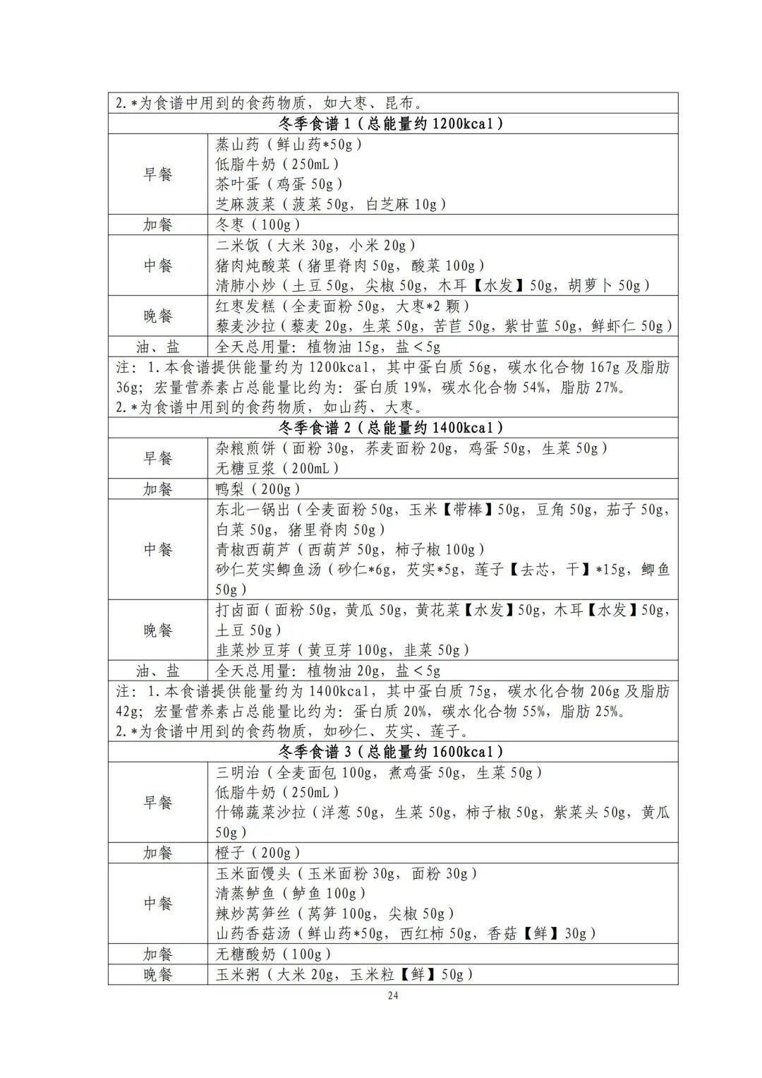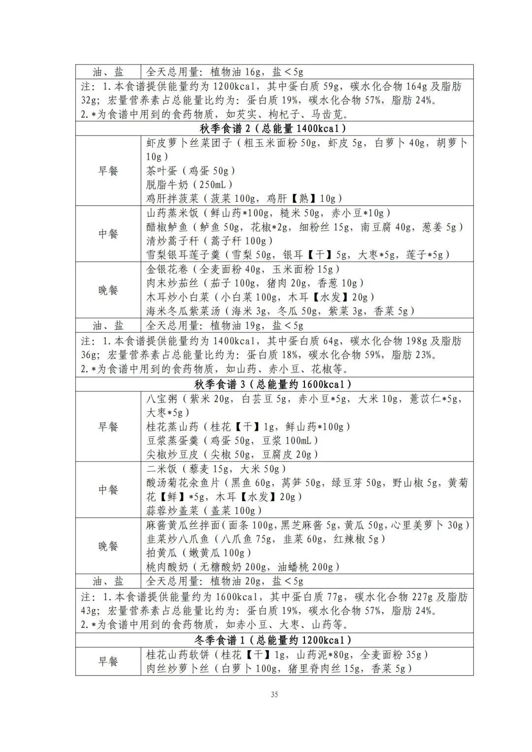 这份食谱细化到了全国不同地区的食谱示例,并备注了食谱的“总能量”。