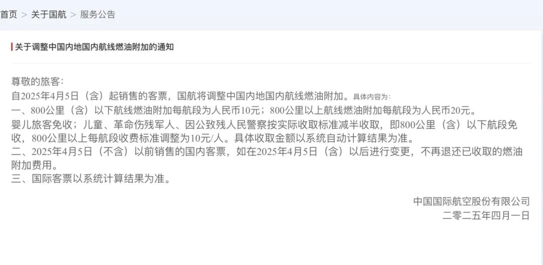 2025年4月1日多家航空公司消息将下降国内航线燃油附加费