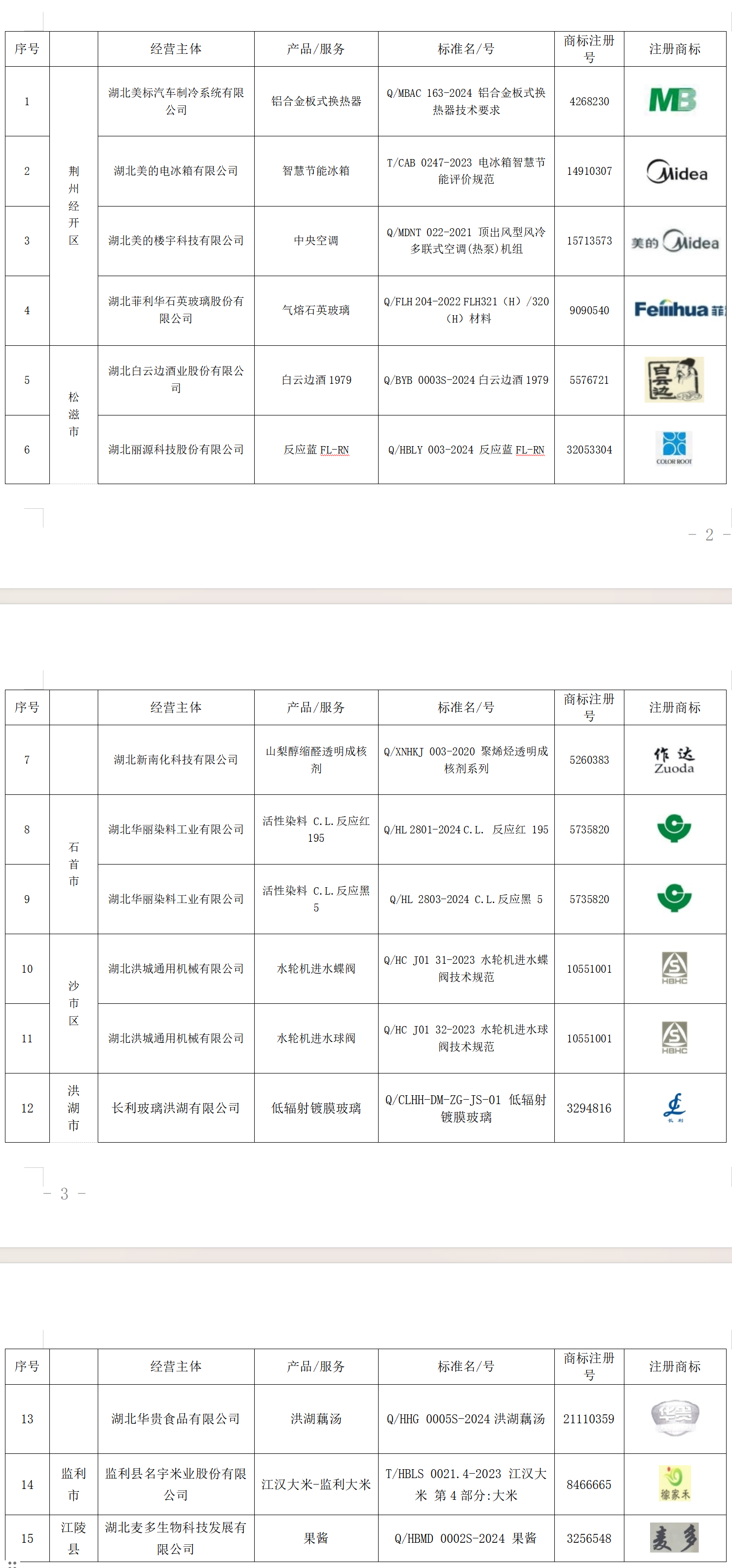 “湖北精品”是全省卓越质量品牌的杰出代表,是地方发展的名片。荆州上榜的15个“湖北精品”分别是湖北美标汽车制冷系统有限公司的铝合金板式换热器,湖北美的电冰箱有限公司的智慧节能冰箱、湖北美的楼宇科技有限公司的中央空调、湖北菲利华石英玻璃股份有限公司的气熔石英玻璃、湖北白云边酒业股份有限公司的白云边酒1979、湖北丽源科技股份有限公司的反应蓝FL-RN、湖北新南化科技有限公司的山梨醇缩醛透明成核剂、湖北华丽染料工业有限公司的活性染料C.L.反应红195和活性染料C.L.反应黑5、湖北洪城通用机械有限公司的水轮机进水蝶阀和水轮机进水球阀、长利玻璃洪湖有限公司的低辐射镀膜玻璃、湖北华贵食品有限公司的洪湖藕汤、监利县名宇米业股份有限公司的江汉大米-监利大米、湖北麦多生物科技发展有限公司的果酱。