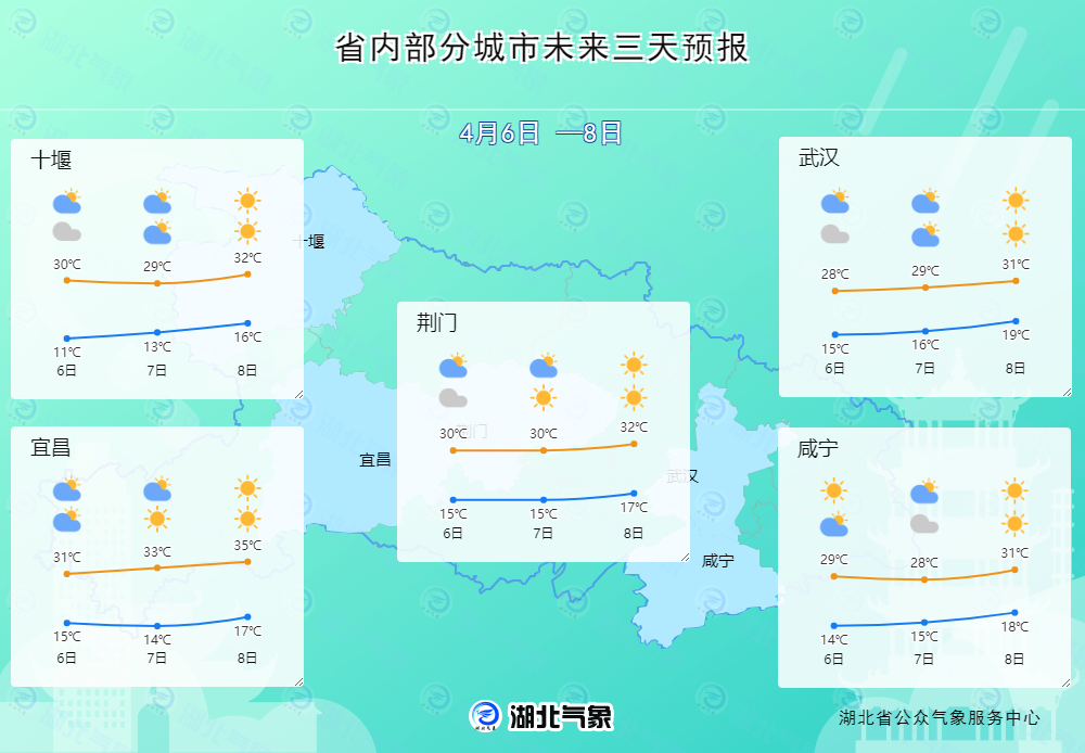 4月6日08时-7日08时,全省多云到晴天。最高气温恩施地区19~24℃、其他地区25~30℃,最低气温10~16℃,偏南风3到4级、阵风5级。