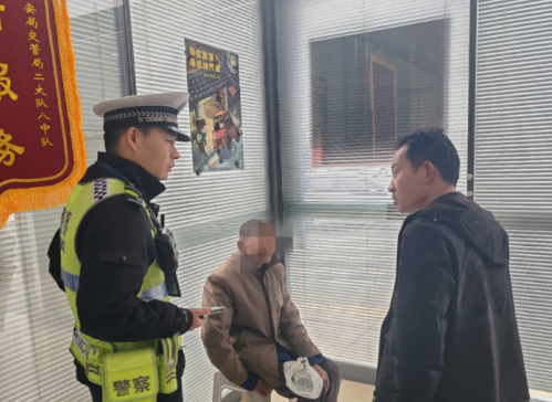 当日上午9时,二大队八中队民警向绪亭在塔桥路口执勤时,发现一位瘦弱的老人拄着拐杖步履蹒跚地在路口张望,神情迷茫。民警立即上前搀扶老人至安全区域,并耐心询问情况。由于老人年岁已高,言语不清,只含糊表示自己“找不到家了”。民警一边安抚老人情绪,一边上报指挥中心一边进行身份信息核查。