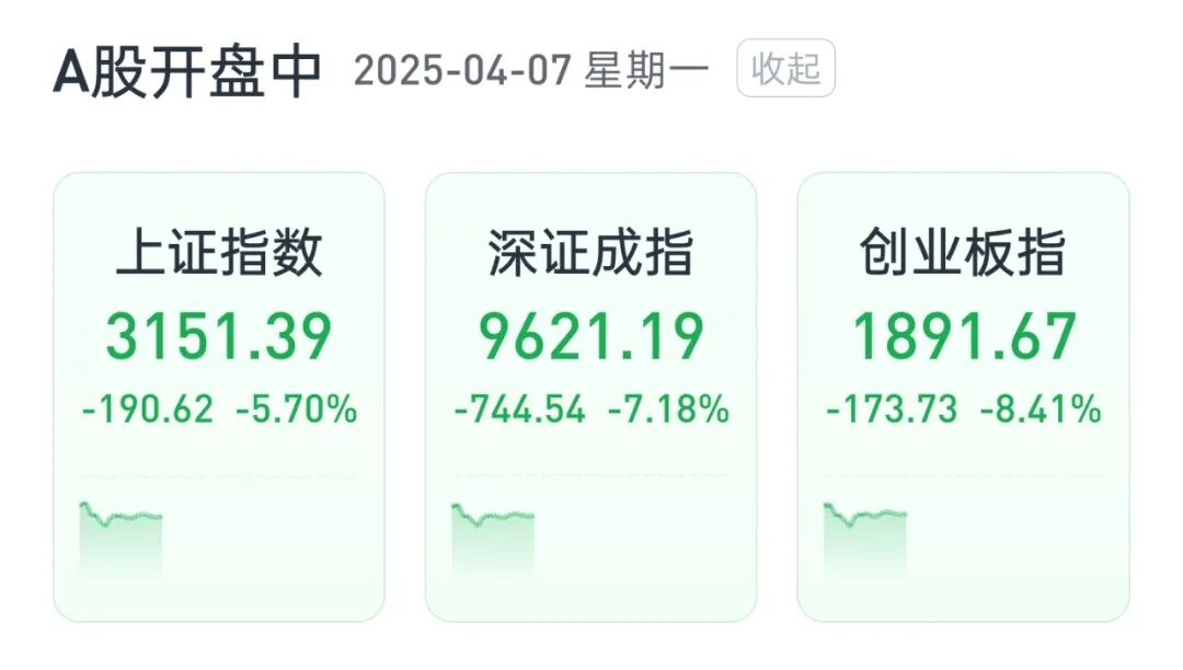 4月7日,A股开盘,三大指数集体低开。沪指开3193.10点,跌4.46%,深成指开9747.66点,跌5.96%,创业板指开1925.64点,跌6.77%。