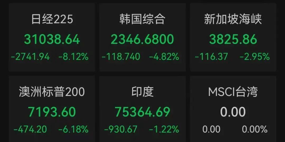 亚洲其他股市周一也出现大跌,日经225指数期货、东证指数期货在触及跌停板后暂停交易。韩国股市同样大幅下挫,韩国交易所在KOSPI 200指数期货下跌5%后,启动了停牌机制,并暂停程序化交易5分钟。澳大利亚S&P/ASX 200指数开盘下跌2.75%,随后跌幅迅速扩大,截至发稿跌超6%。新加坡股市7日开盘后延续下行走势,海指下跌7.29%。