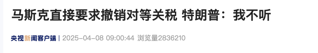 当地时间4月7日,《华盛顿邮报》援引两位消息人士的话报道称,在过去的周末,美国政府效率部门负责人、全球首富马斯克直接向美国总统特朗普发出了撤销新关税政策的呼吁。报道称,马斯克的尝试没有成功。