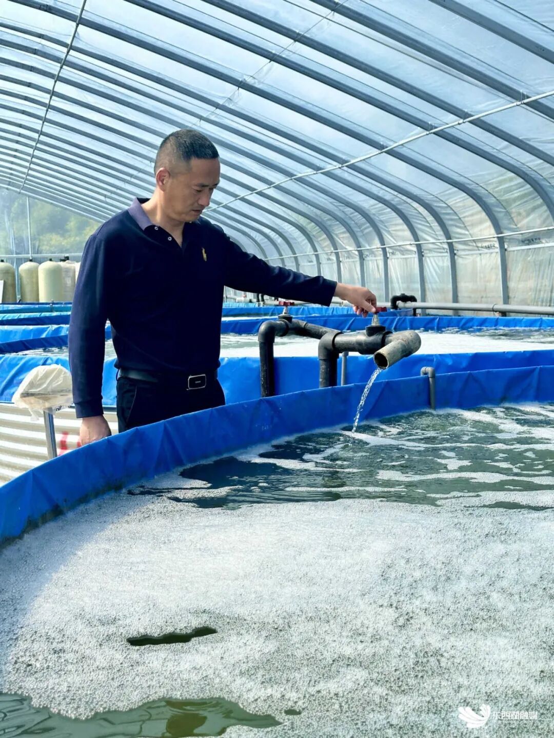 棚内的智能水控系统,实时精准调节桶内水量、水温,以及自动换水,确保水温恒定在22-25℃的最佳区间,水体溶氧量始终维持标准数值。