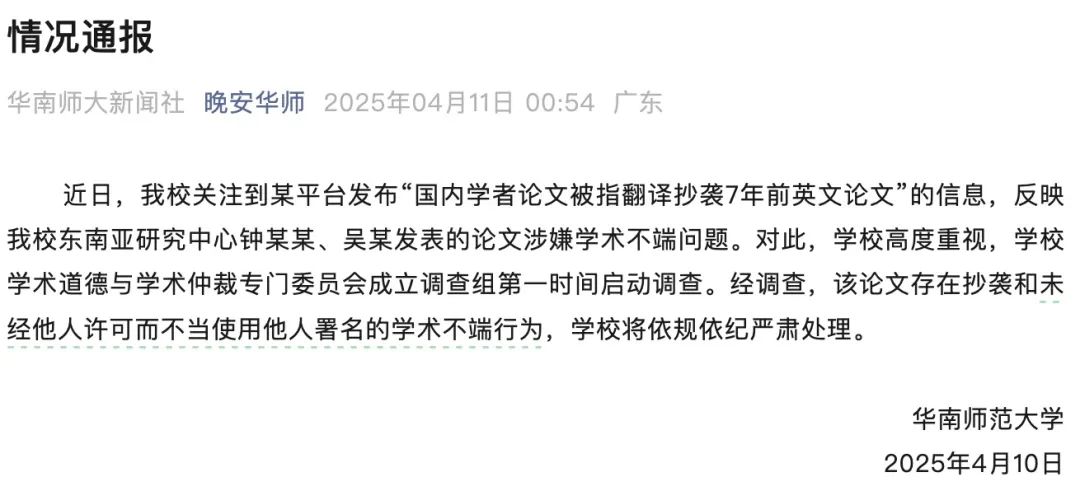 近日,我校关注到某平台发布“国内学者论文被指翻译抄袭7年前英文论文”的信息,反映我校东南亚研究中心钟某某、吴某发表的论文涉嫌学术不端问题。对此,学校高度重视,学校学术道德与学术仲裁专门委员会成立调查组第一时间启动调查。经调查,该论文存在抄袭和未经他人许可而不当使用他人署名的学术不端行为,学校将依规依纪严肃处理。