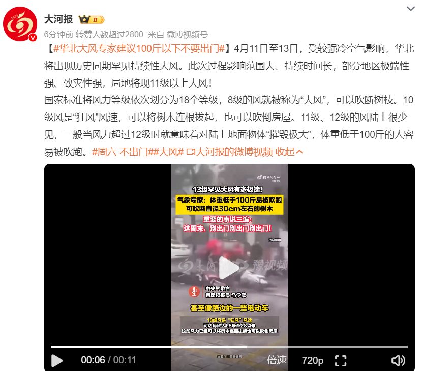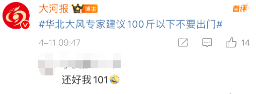 今日,话题#华北大风专家建议100斤以下不要出门#冲上热搜。