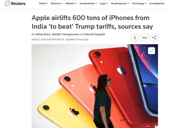 据路透社10日援引消息人士透露,苹果公司租用货运航班从印度向美国紧急运送600吨 iPhone(或多达150万部),以应对美国的关税政策。