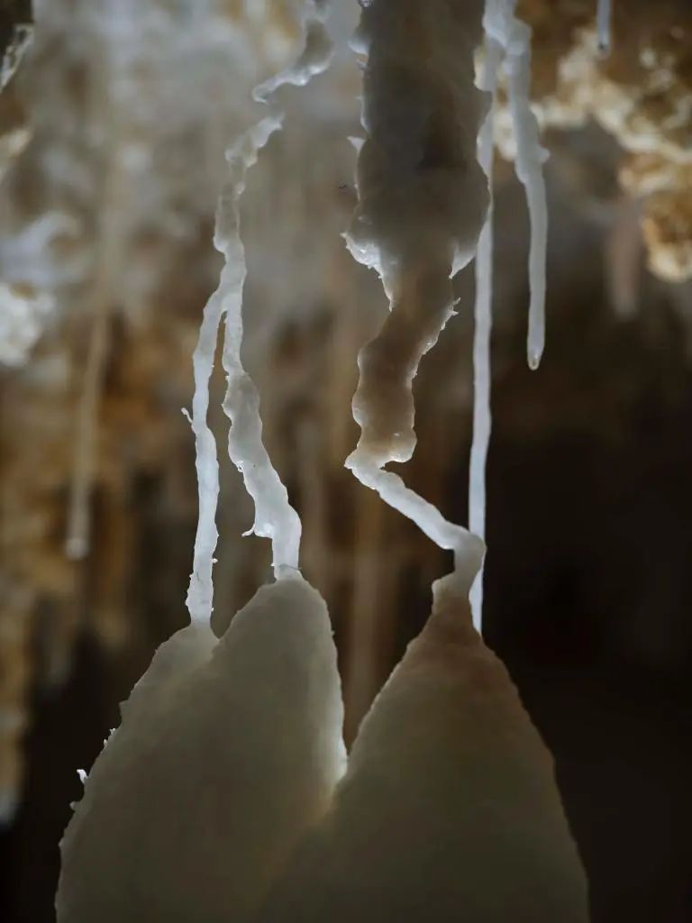 洞内有的穹顶高达100余米,水滴在下坠过程中雾化成富含碳酸氢钙的“气溶胶”。在石笋、洞底凝结出千奇百态的石花、石枝、石葡萄、石珊瑚等,形成“雾化沉积”奇观。