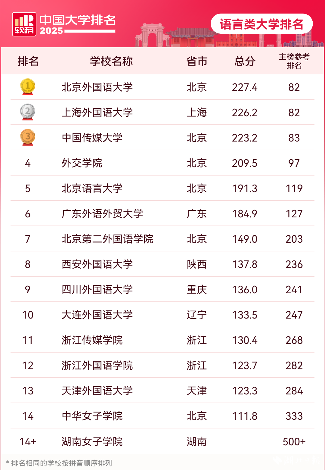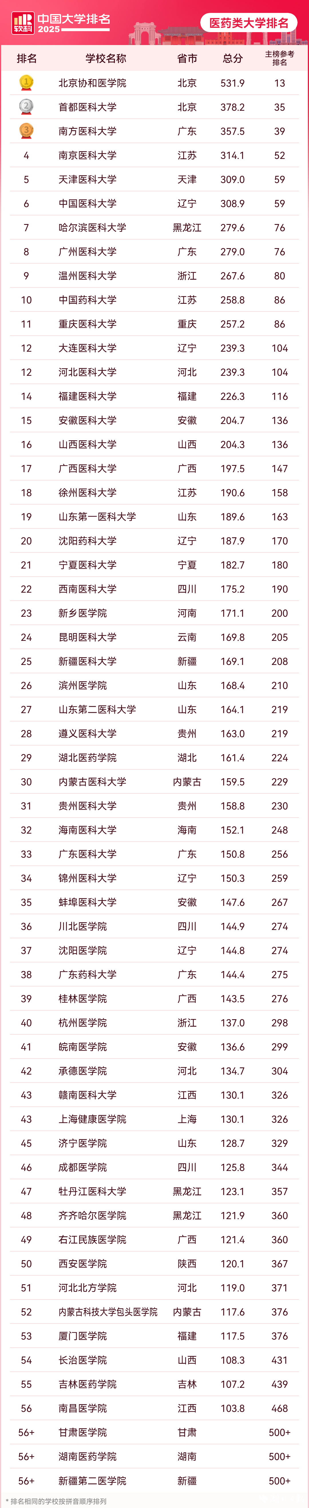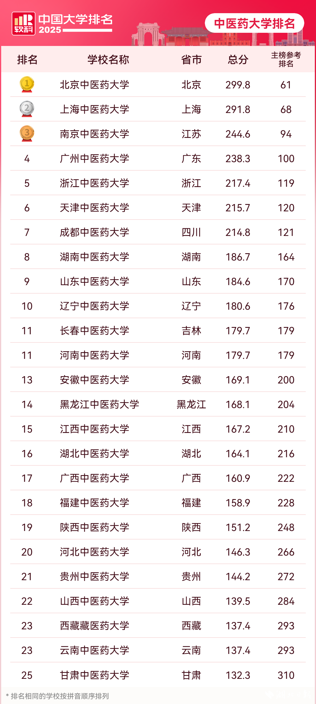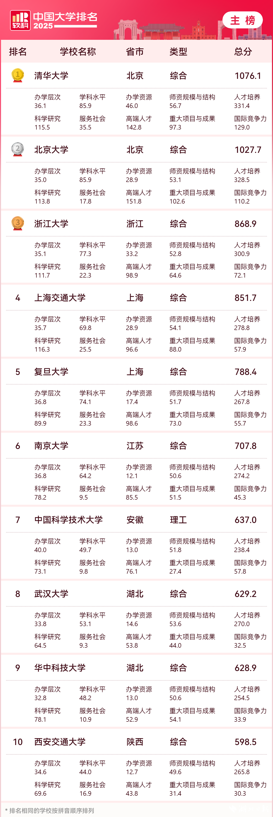 据悉,“软科中国大学排名”依托“大学360度数据监测平台”的大数据支持,采用数百项指标变量对中国大学进行全方位、体系化、监测式评价,已经成为具有重要社会影响力和权威参考价值的中国大学排名领先品牌。今年,清华大学、北京大学、浙江大学稳居主榜前三位。北京协和医学院拔得医药类大学排名头筹,北京中医药大学位居中医药大学排名第一,上海财经大学名列财经类大学排名首位,北京外国语大学摘得语言类大学排名桂冠,中国政法大学荣登政法类大学排名榜首,中央民族大学位列民族类大学排名第一,上海体育大学领跑体育类大学排名,香港中文大学(深圳)夺得中国合作办学大学排名魁首。