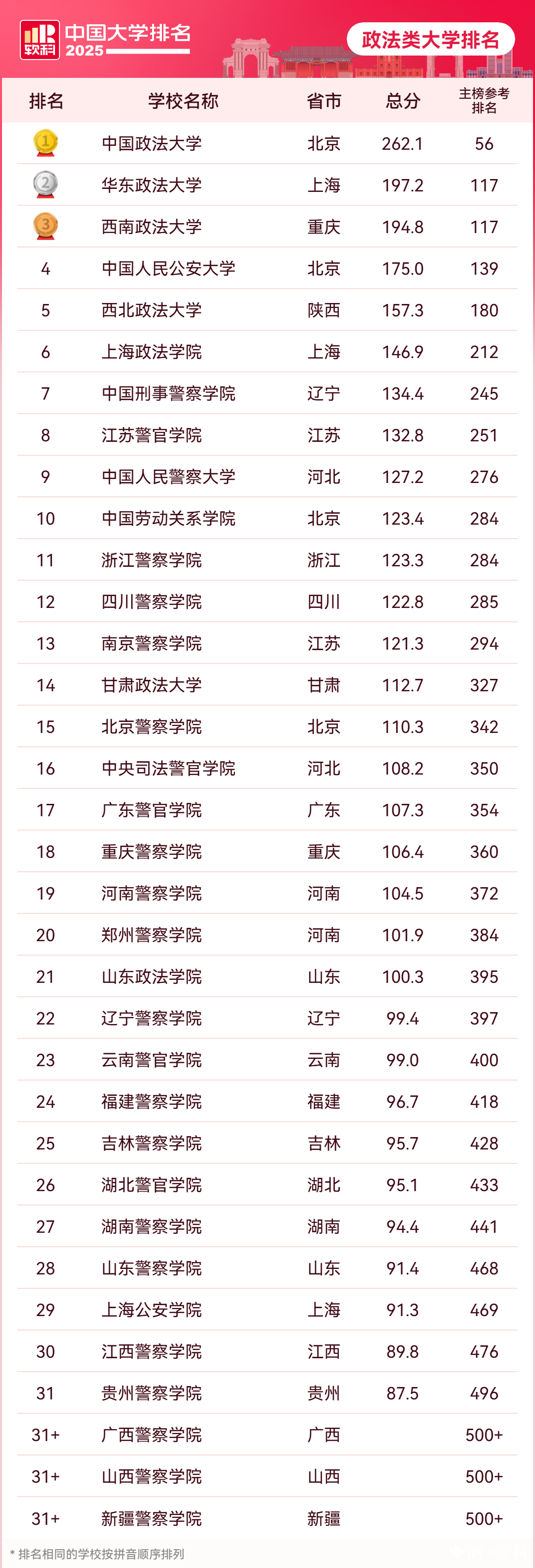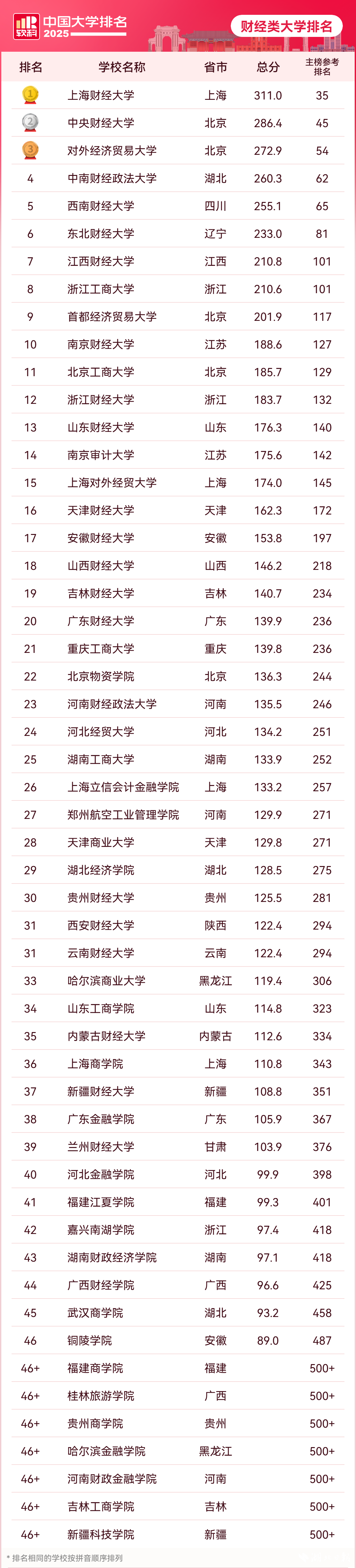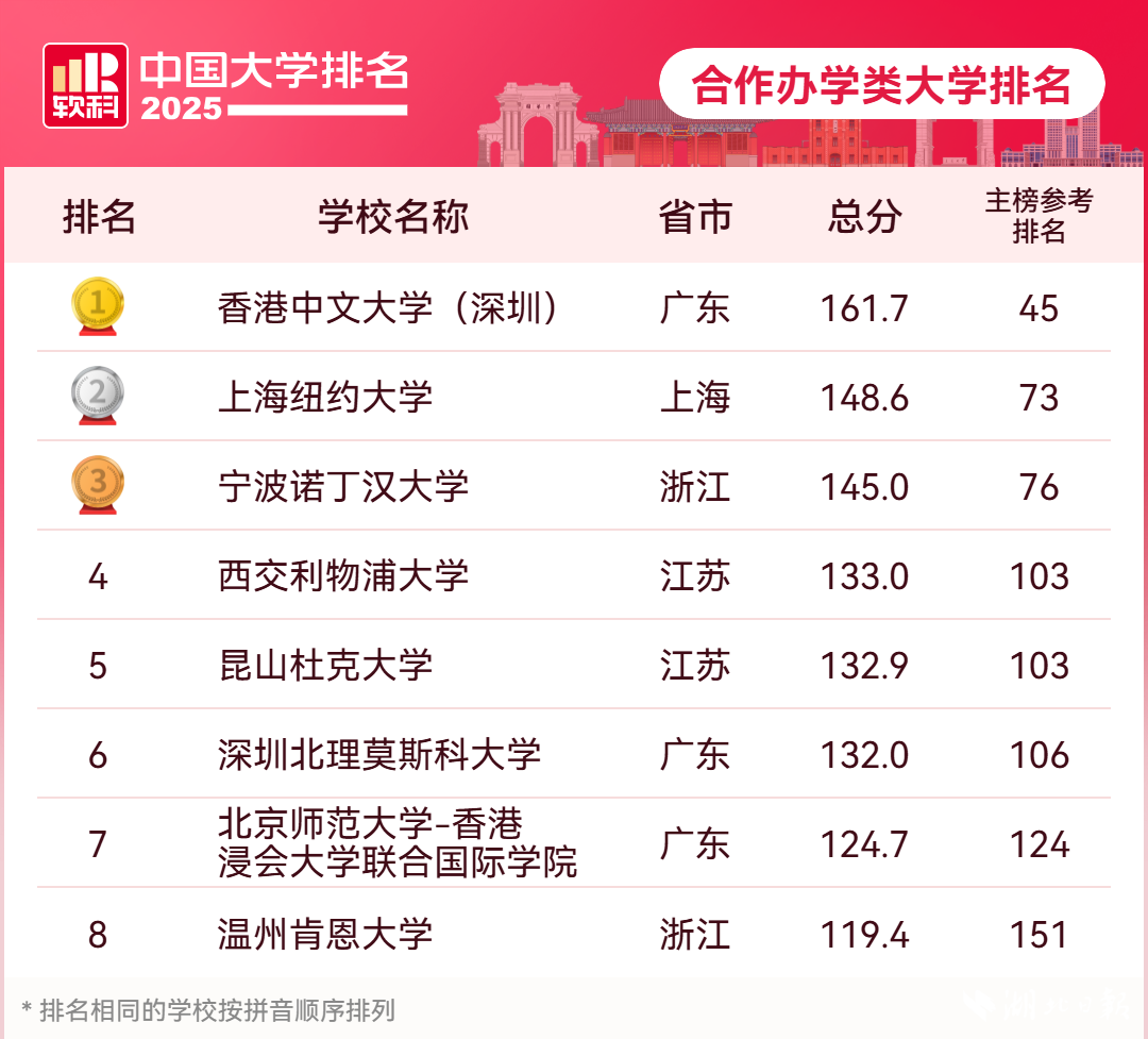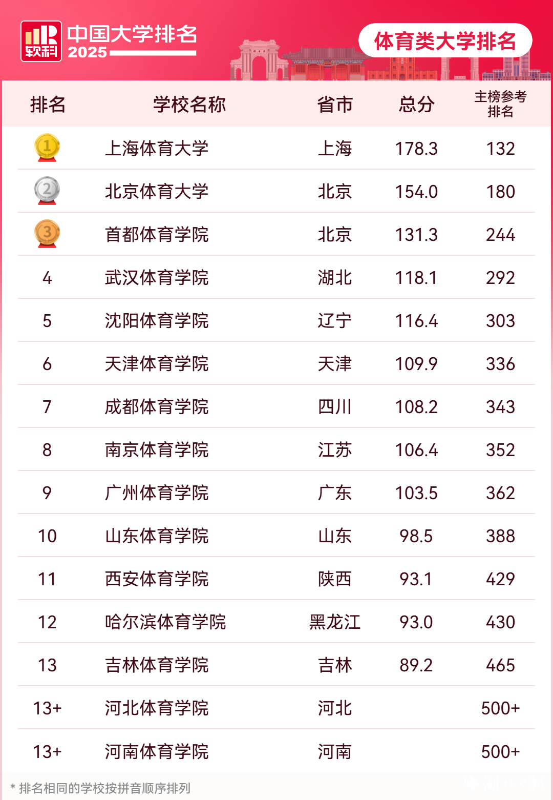 据悉,“软科中国大学排名”依托“大学360度数据监测平台”的大数据支持,采用数百项指标变量对中国大学进行全方位、体系化、监测式评价,已经成为具有重要社会影响力和权威参考价值的中国大学排名领先品牌。今年,清华大学、北京大学、浙江大学稳居主榜前三位。北京协和医学院拔得医药类大学排名头筹,北京中医药大学位居中医药大学排名第一,上海财经大学名列财经类大学排名首位,北京外国语大学摘得语言类大学排名桂冠,中国政法大学荣登政法类大学排名榜首,中央民族大学位列民族类大学排名第一,上海体育大学领跑体育类大学排名,香港中文大学(深圳)夺得中国合作办学大学排名魁首。