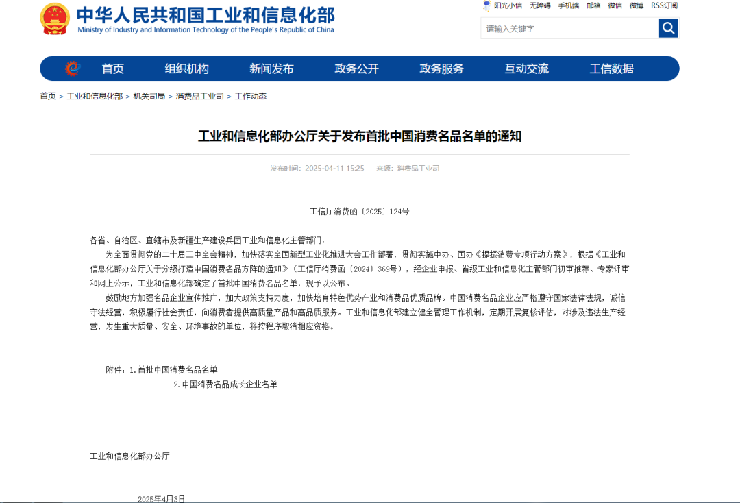 中国消费名品名单是经企业申报、省级工业和信息化主管部门初审推荐、专家评审和网上公示之后,再经工业和信息化部最终确定。