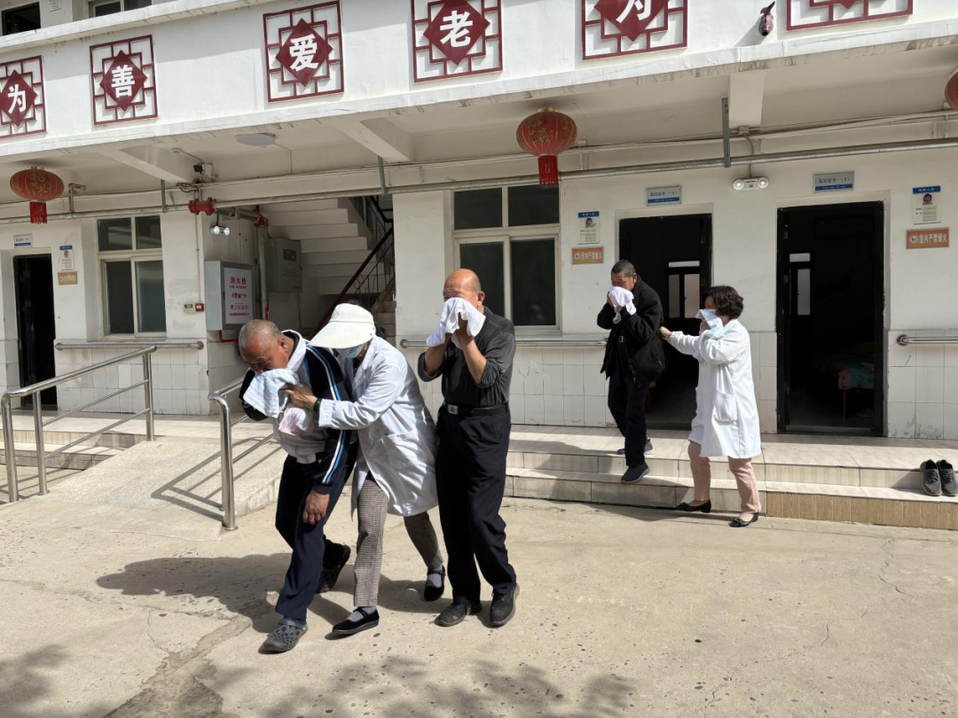 演练模拟福利院1楼住宿室因电器短路引发“火情”。随着警报响起,演练正式开始,消防专班立即启动应急预案,护工组引导老人用湿毛巾掩住口鼻,沿安全通道撤离;消防员同步架设水枪扑灭火源,开辟救援通道,实现“零差错”衔接。