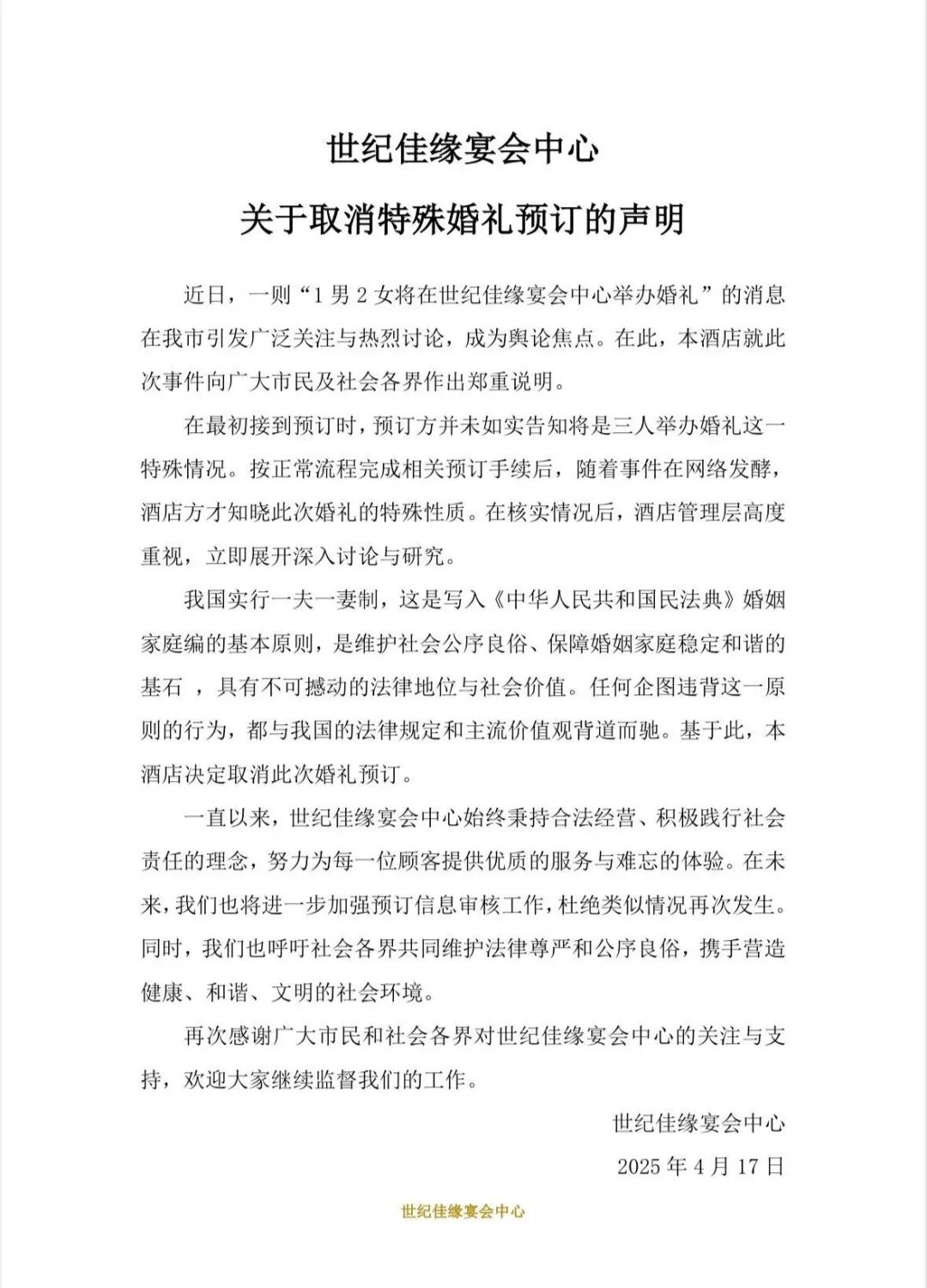 对此,4月17日,贵州世纪佳缘宴会中心发布声明称,在最初接到预订时,预订方并未如实告知将是三人举办婚礼这一特殊情况。在核实情况后,决定取消特殊婚礼预订。目前,这则声明已被删除。