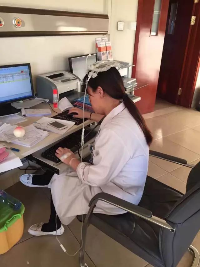 照片中,她头顶着输液袋,左手打着点滴,还在电脑前写材料。她为啥会这样呢?