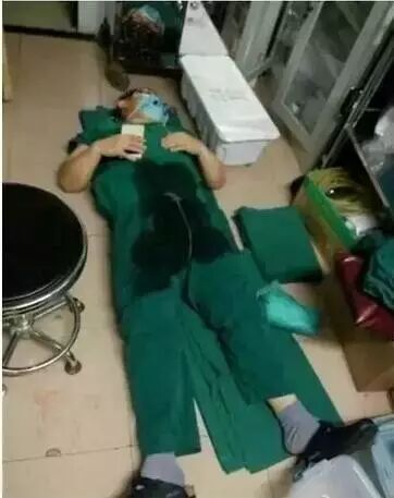 凌晨3时许,工作12个小时后,河南洛阳市中心医院外科主任陈兴彭在手术室就地休息,衣服前胸后背已经被汗水浸透。他的手机定了闹钟,但睡了不到10分钟,闹钟没响,他就起来了,接着做手术。