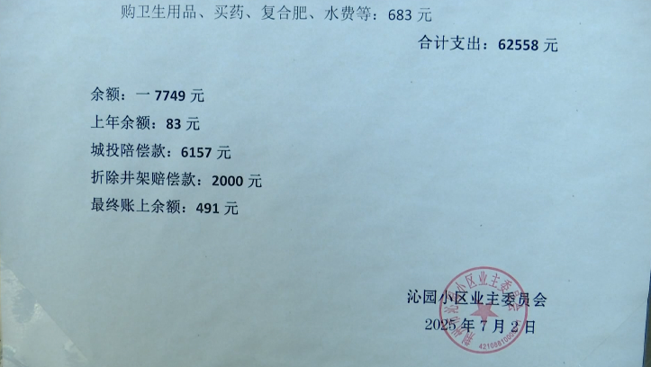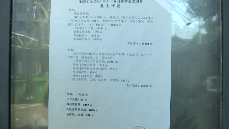 记者在小区原先的物业办公室看到,里面已经空无一人,门口贴着一张业委会公布的沁园小区2025年一到六月物业管理费收支情况,上面写着所有明细以及最终账上余额是491元。下面还有一张公告,写着沁园小区目前正在进行业委会换届选举。落款是城南街道新风社区。随后,记者联系了新风社区工作人员了解情况。