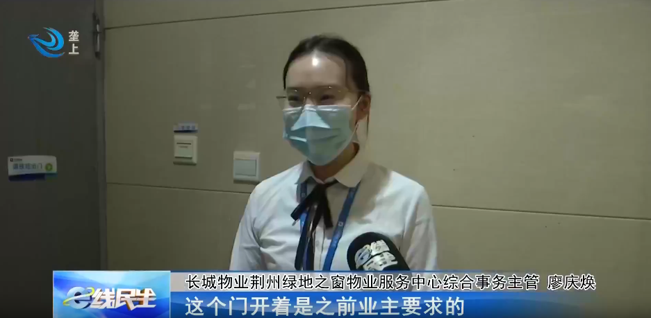 长城物业荆州绿地之窗物业服务中心综合事务主管廖庆焕:我们小区的门禁一直是好的,门禁按了之后能开。这个门开着是之前业主要求的,他们觉得防火门特别重,有的小孩就算刷了也推不开,从入住的时候要求我们打开,我们后来就一直打开。