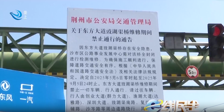 记者来到位于东方大道的豉湖渠桥时,桥梁的入口处用围挡遮住,一处围挡上贴着公告,上面写着豉湖渠桥存在安全隐患,沙市区公路事业发展中心需要对该桥全封闭进行维修检测,时间为2025年5月6日至9月5日。围挡不远处有工作人员对该处交通进行疏导。